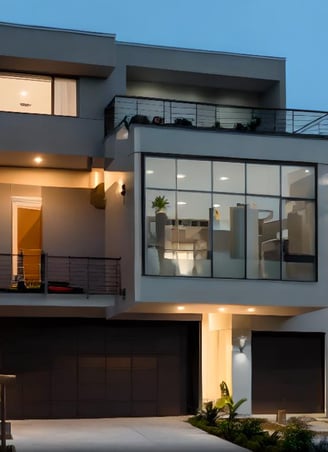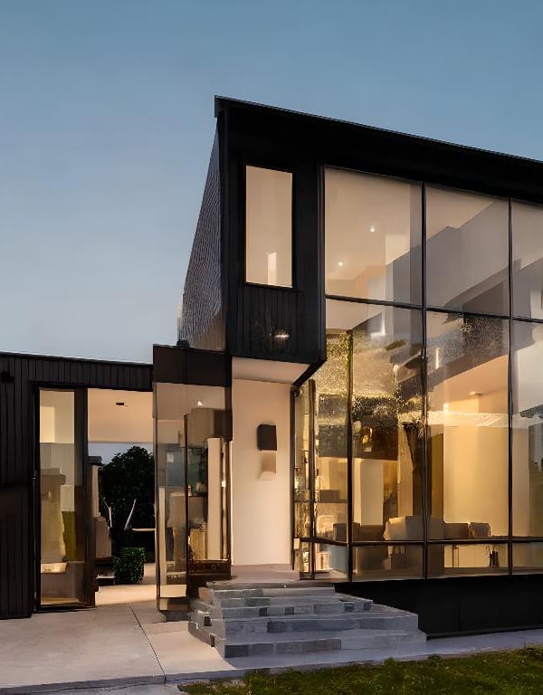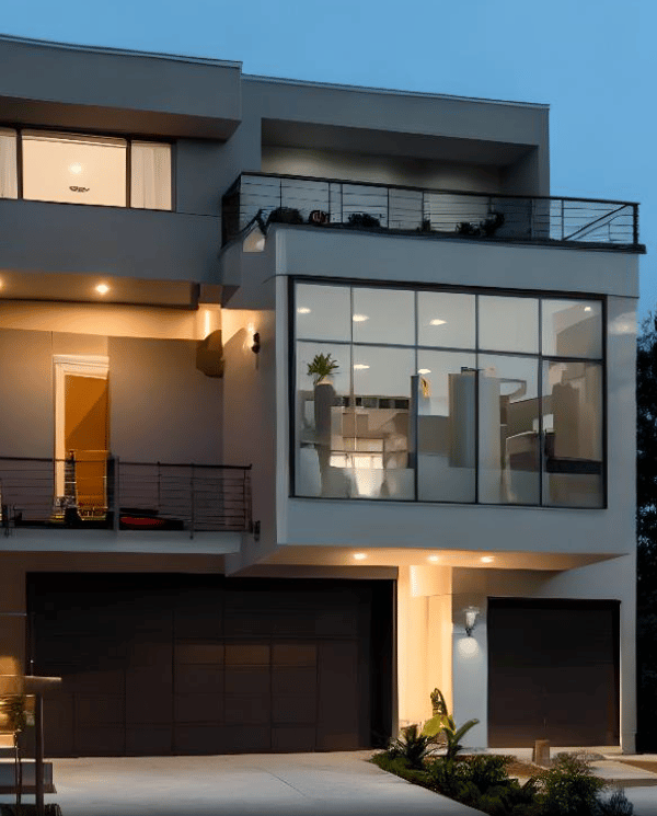 La fachada muestra un estilo moderno y complejo dando un pequeño adelanto con el ventanal a la sala de estar.